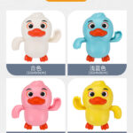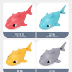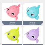 Brinquedos de banho para brincar na água, com desenhos animados de um pato, um tubarão e um baiacu.